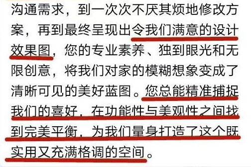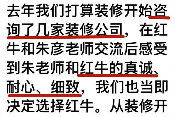 這次找紅牛裝飾公司裝修,也是朋友介紹的。各方面安排比較及時到位,質(zhì)量控制上也比較好,總體感覺滿意。設(shè)計師顧娟工作負責,業(yè)務(wù)能力、協(xié)調(diào)能力都較強,為這次裝修的滿意完工奠定了基礎(chǔ)!項目經(jīng)理錢新平統(tǒng)籌能力較強,工作負責,安排的水電工、瓦工、木工和油漆工都比較認真負責,手藝也不錯,保證了裝修的施工質(zhì)量。工程監(jiān)理宋昕業(yè)務(wù)精湛,工作認真負責,對裝修施工考慮全面,對質(zhì)量要求嚴格,經(jīng)常深入工地巡查,發(fā)現(xiàn)問題及時指出,很好地為施工質(zhì)量把了關(guān)。這次找紅牛裝飾公司裝修的體驗是愉快的,謝謝各位!
